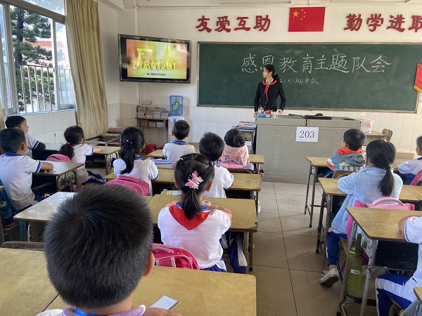 7月5日-6日中午,为了能让学生们接受到感恩的教育,班主任从学习强国学习平台里转发《感恩教育》视频给家长,请家长与学生进行亲子学习,并以“感恩教育”为主题开展了一节队会课。