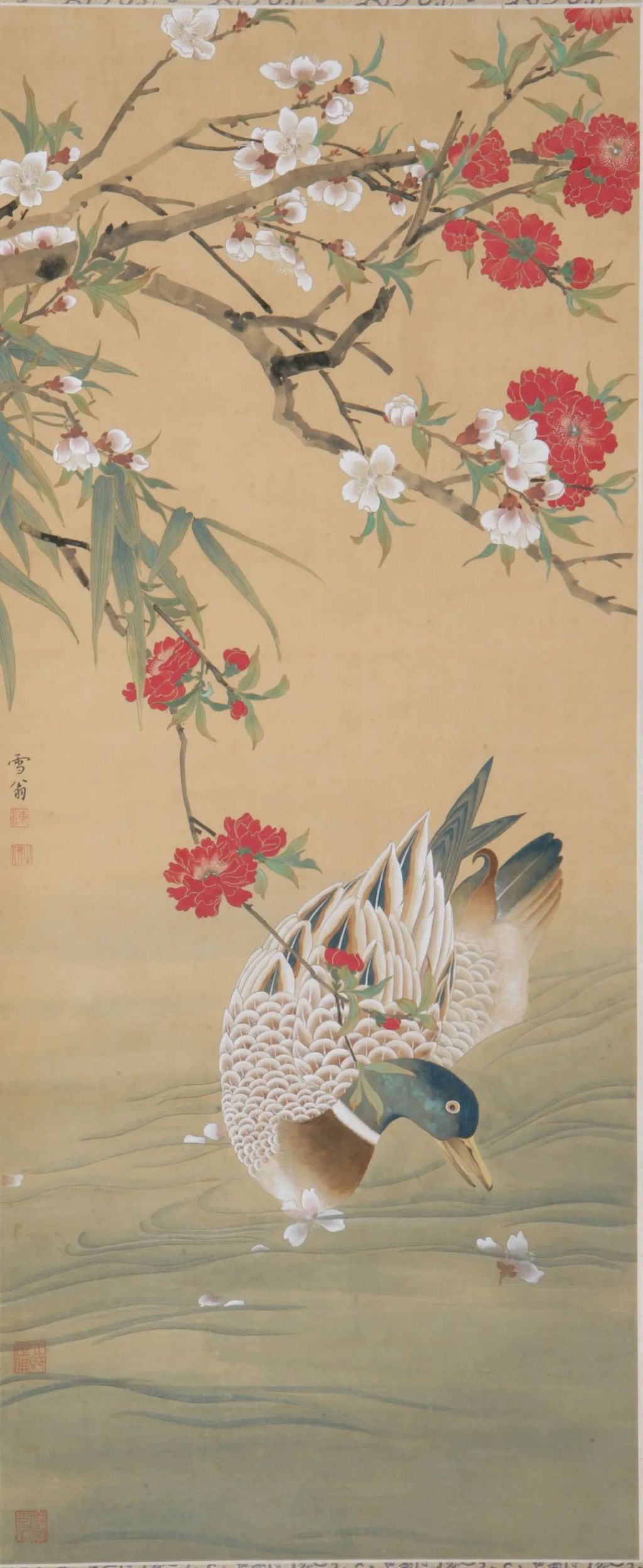 陈之佛认为“花鸟画很讲究形式美,一幅优秀的花鸟画,往往是形式美的处理最得法,也是最符合人们欣赏要求的东西;而表达花鸟画上的形式美,主要又在构图和设色两方面。”构图与设色便成为陈之佛工笔花鸟画形式美感的重要表现路径。《桃竹花鸭》便是构图和设色相得益彰的佳作。该画取“春江水暖鸭先知”之诗意,采用中国传统工笔花鸟画的竖幅折枝式构图,笔意通达畅神,设色丽中见雅。点点桃花,红白相间,几枝摇曳的绿竹穿插其间,更显桃花娇艳。一只色彩斑斓的鸭子在水中嬉戏,一派生机盎然的景象。画面有自上而下的动势,花枝从画幅的左上角起,逐渐向下发展延伸,引出花下的溪水逐花的鸭子。画面下部的色调以素雅的冷色为主,画面上部的色调以热闹的暖色为主,一冷一暖、一动一静,形成一派和谐清新的画面。